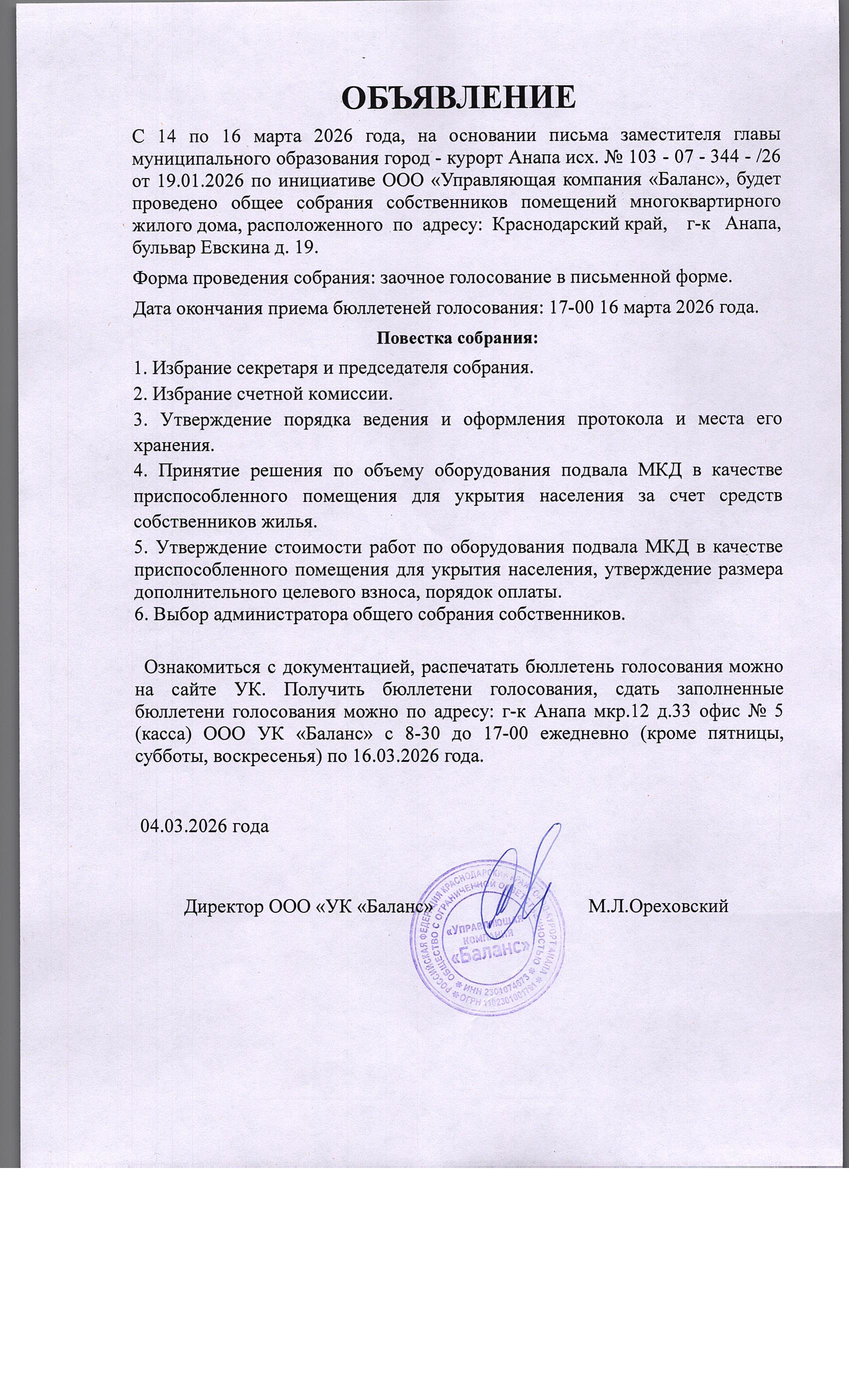 Договор управления и содержания имущества многоквартирного дома бульвар Евскина, дом 19 >>>>